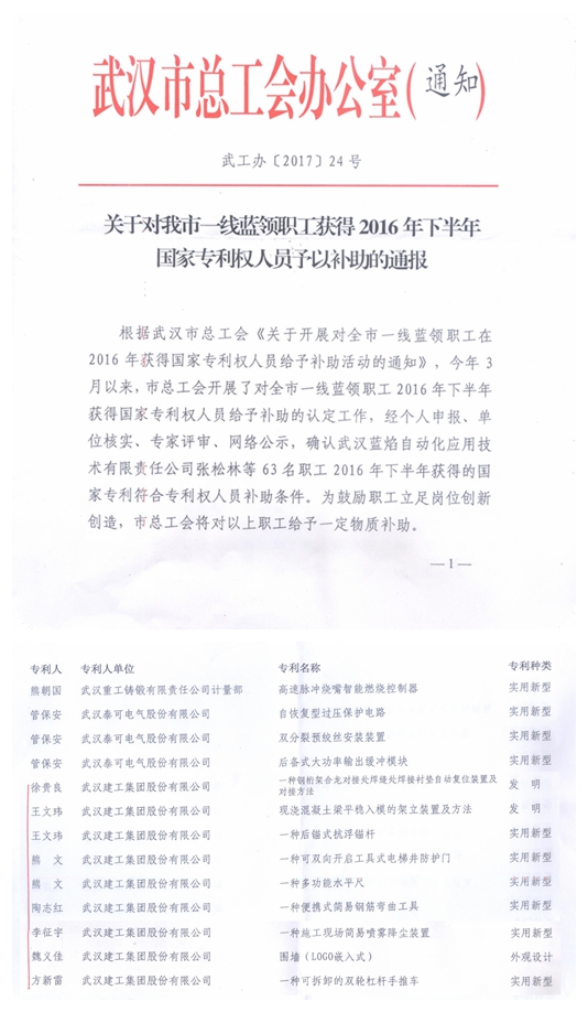 為鼓勵(lì)職工立足崗位創(chuàng)新創(chuàng)造,近日武漢市總工會(huì)對2016年下半年獲得國家專利權(quán)的一線職工發(fā)放了專利補(bǔ)助。經(jīng)過個(gè)人申報(bào)、單位核實(shí)、專家評審、網(wǎng)絡(luò)公示,全市共確認(rèn)了63名具備補(bǔ)助條件的職工,其中武建集團(tuán)的徐貴良、熊文、王文瑋等7位員工取得的《一種鋼桁架合攏對接處焊縫襯墊自動(dòng)復(fù)位裝置及對接方法》等9項(xiàng)專利成果入選。